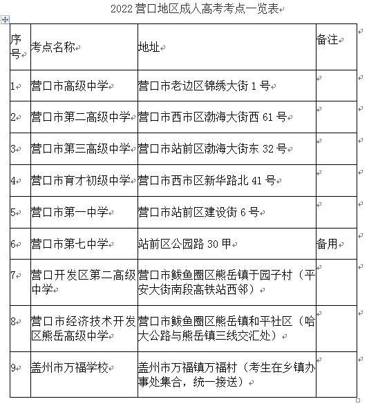2.營口市內(nèi)考區(qū)接收現(xiàn)居住在站前區(qū)、西市區(qū)、老邊區(qū)、大石橋市的考生及域外返營的考生參考;鲅魚圈區(qū)考區(qū)接收現(xiàn)居住在鲅魚圈區(qū)域內(nèi)的考生參考;蓋州市考區(qū)接收現(xiàn)居住在蓋州市域內(nèi)的考生參考。